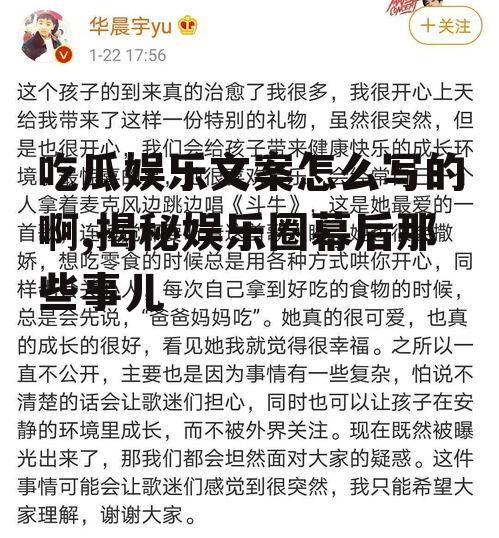 你有没有发现,现在不管是朋友圈还是微博,吃瓜娱乐文案简直成了潮流!一篇好的吃瓜文案,不仅能让你在朋友圈里成为焦点,还能让你的朋友们觉得你是个紧跟潮流的时尚达人呢!那么,吃瓜娱乐文案到底怎么写呢?让我来给你支支招吧!